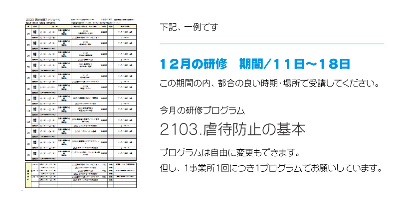 研修開始は年間研修計画書のに従って受講して頂きます。計画書の内容については、研修の差し替えなど自由に組み換えが可能です。